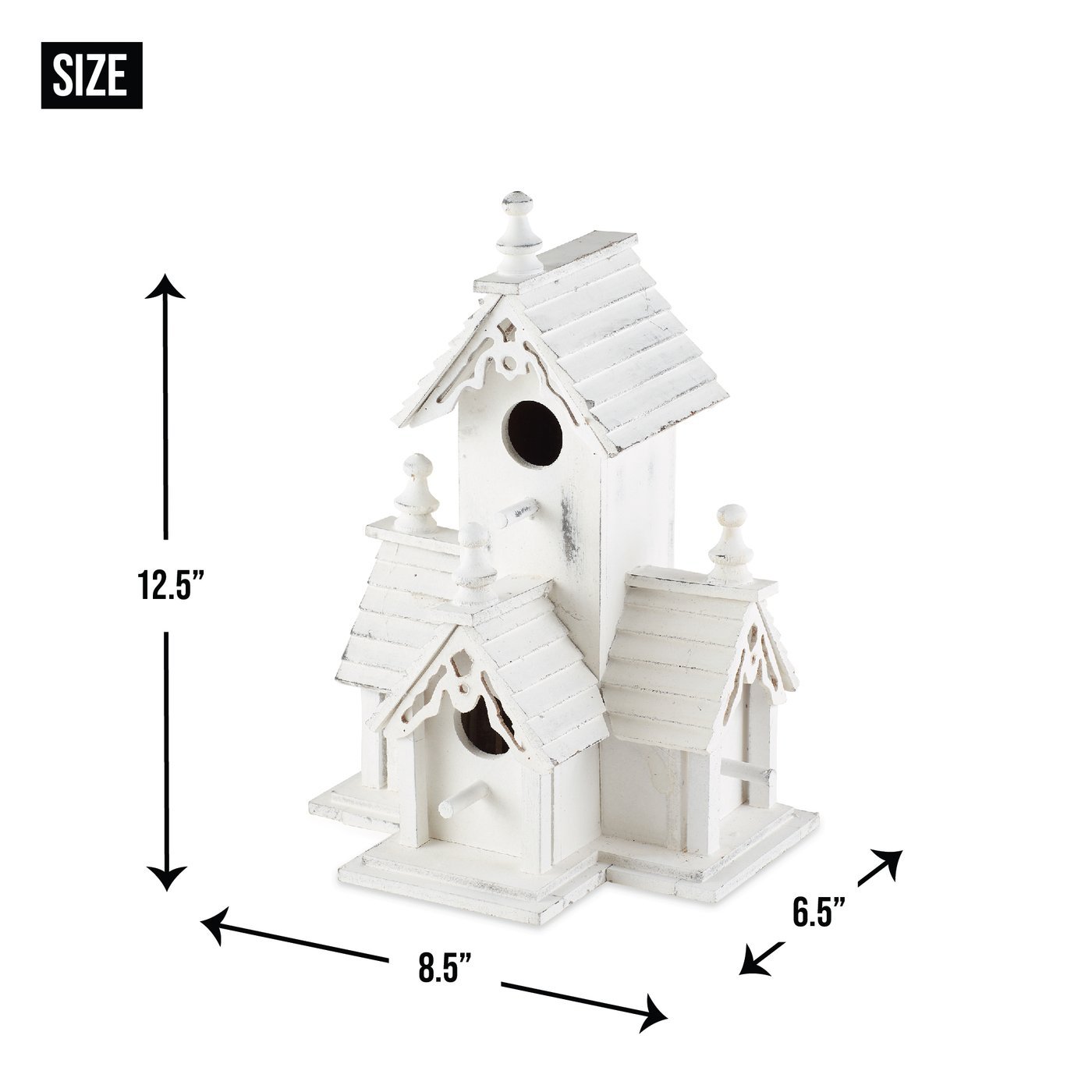 • Victorian-style birdhouse features distressed white-finished wood, multiple entrances, and detailed wood trim with an heirloom look.